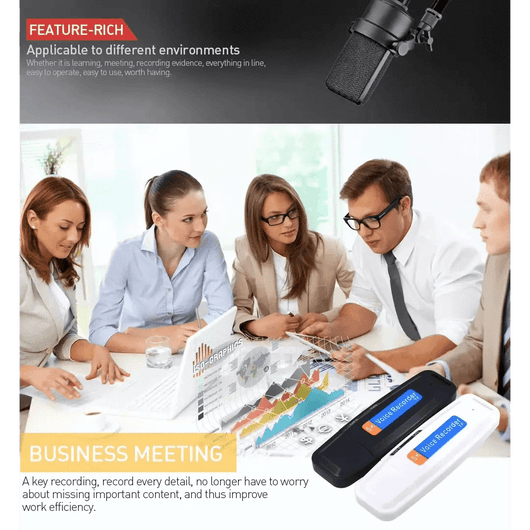 Caractéristiques : 10 heures de batterie, longue autonomie Le son peut être clairement enregistré à une distance de 6 mètres Branchez-le sur votre ordinateur pour écouter les enregistrements, et charger la batterie Fonctionne sur tous les ordinateurs, aucun logiciel requis Comment utiliser : Sur le côté de la clé USB, il y a un petit interrupteur d'alimentation. Lorsque vous actionnez l'interrupteur, l'enregistreur vocal s'allume et commence à enregistrer tout ce qui se trouve à proximité. Une fois l'enregistrement terminé, appuyez sur l'interrupteur pour éteindre l'appareil. Pour entendre l'enregistrement que vous venez de faire, branchez-le sur votre ordinateur. Un dossier provenant de la clé USB s’ouvrira automatiquement. Vos conversations seront enregistrées dans ce dossier.
